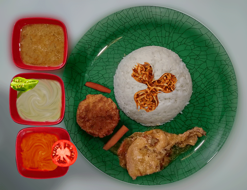 Rice Chicken Aloo Chop Gravy Pickle Tomato Sweet Sauce Milky Naga Sauce hot.